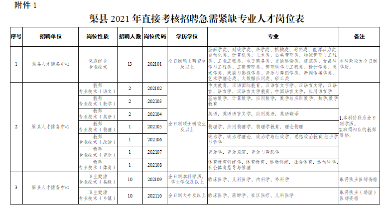 附件:1.渠縣2021年直接考核招聘急需緊缺專業人才崗位表