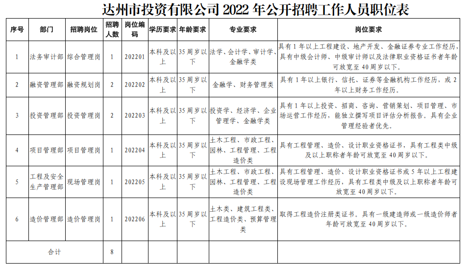 本次公開招聘設置崗位6個,擬招聘工作人員8人,其中:法務審計部1人、融資管理部2人、投資管理部2人、項目管理部1人、工程及安全生產管理部1人、造價管理部1人。